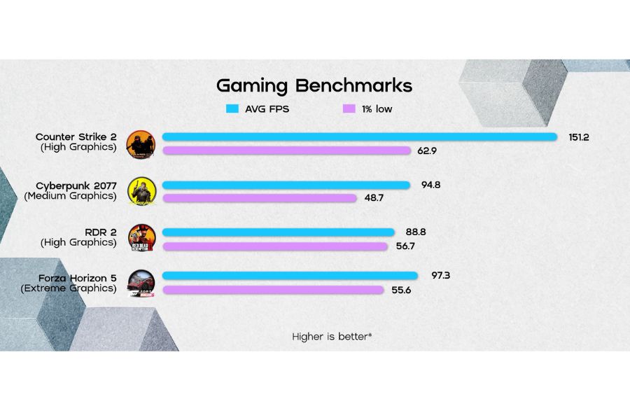 In my short and sweet venture, I ran Cyberpunk 2077 at Medium settings without DLSS or RayTracing and got about 95FPS with minimal drops during gameplay. Fora Horizon 5 at Extreme Preset also ran similarly with a near 100FPS average and 1% of around 55 FPS!