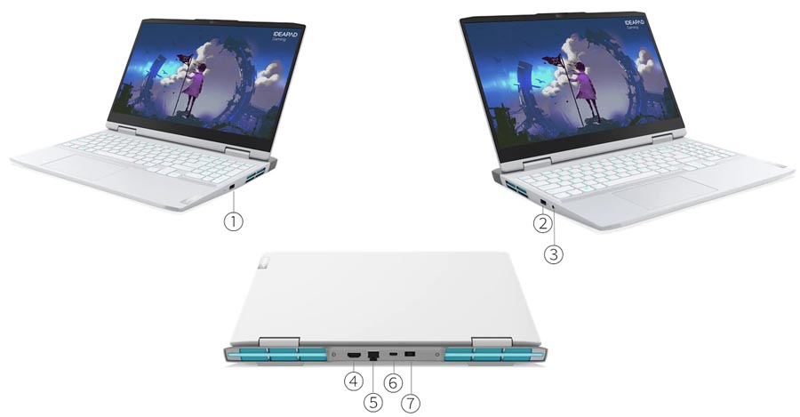 IdeaPad Gaming 3i: 2x USB 3.2 Gen 1 Type-A, 3x USB 3.2 Gen 2 Type-C (Thunderbolt 4 on RTX3050 Ti and RTX 3060 models), 1x HDMI 2.0, 1x 3.5mm combo audio jack, 1x RJ45 (LAN), 1x power connector