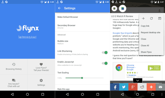 Flynx is a minimal browser that takes the form of floating bubble. So if you come across any link you don’t have to leave that app to visit the link, you can simply open it in the same app window. It usually displays sites on lite version of the web which makes loading of content faster. also it allows you to view in desktop mode making this app no less than any other full fledge browser. You can also save the webpages for later which is a great handy feature. It is just like the link bubble app but I find it more stable and faster to use.