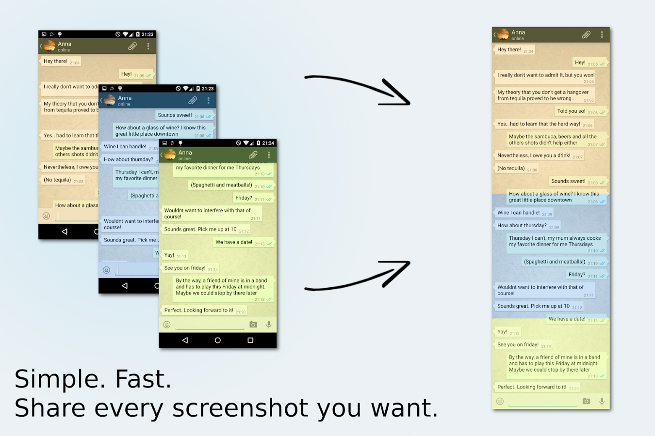 Stitch and share is a handy app that helps you to attach multiple screenshots. All you have to do is match the last message of first screenshot with the first message of second screenshot and so on. You can stitch as much screenshots as you want and make a single image out of it.