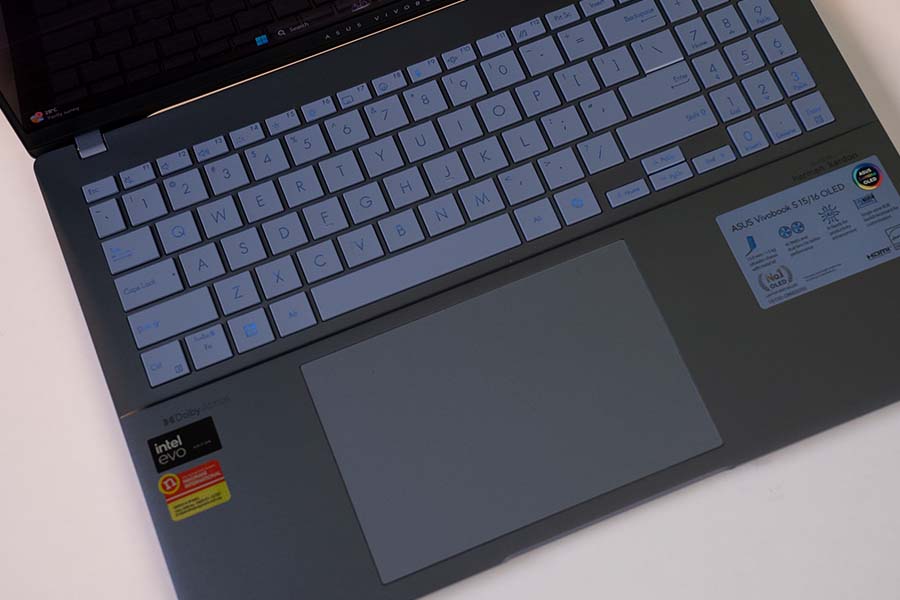 Moving on, I like the keyboard on the Vivobook S16 OLED (2024). It's got decent depth, good spacing, and the colored backlight adds a hint of a unique flavor to the ultrabook. The trackpad is also super large, like Macbook-large, and feels smooth for everyday use. There's plenty of space for swipes and gestures and the responsiveness is decent as well. But like always, I will continue to complain about the diving board mechanism used here and how the (bottom) click responses make the whole experience feel cheap and finicky.