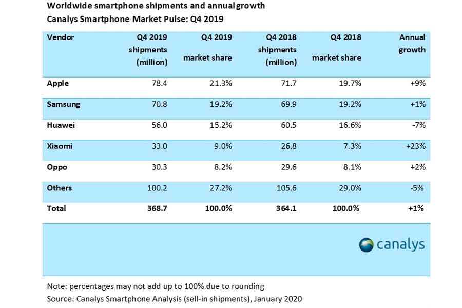 Apple lost to both Samsung and Huawei in the run for the biggest smartphone brand. It couldn't even match its 2018 sales figures. But there is a silver lining as well- Apple managed to top the Q4 smartphone sales for the third year in a row. It managed to sell 78.4 million smartphones in the Holiday period. While Samsung and Huawei experienced drip in sales in the last quarter, Apple's global shipment grew in the same period. If only the Q4 sales were considered, Apple would have topped the other two smartphone brands in the annual growth chart with a growth of 9%. However, it would still fall behind Xiaomi which saw a 23% sales boost in Q4 of 2019 in comparison to Q4 of 2018.