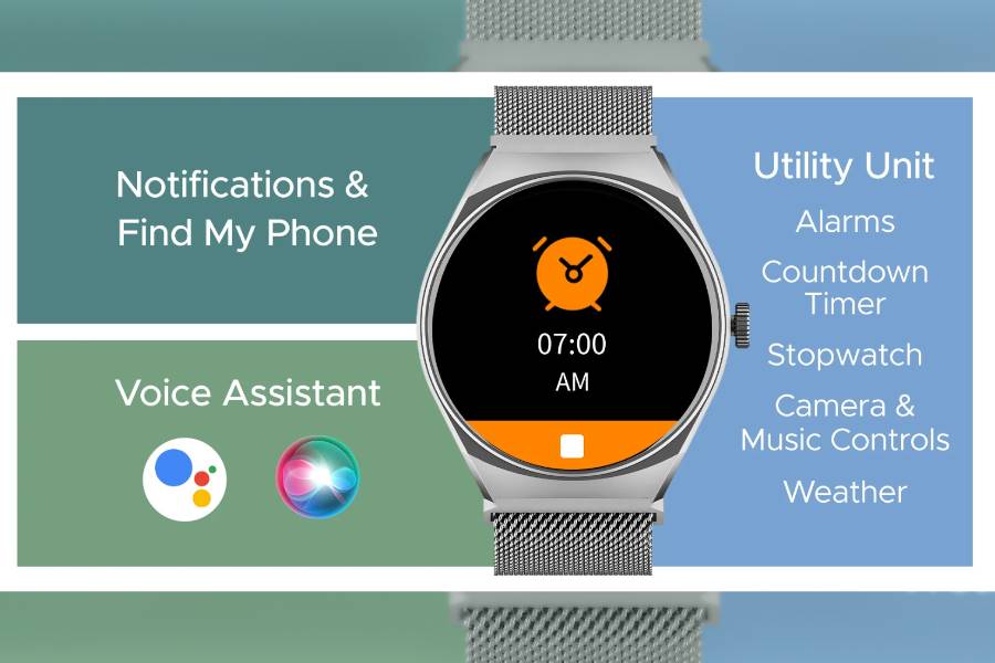 This smartwatch offers all the standard features including time and date, timers, alarms, etc. It can connect to your smartphone via Bluetooth v5.3 and allows you to take and make calls. Likewise, it can also access the voice assistant of the connected device. The boAt Lunar Seek offers health and wellness features, including heart rate and blood oxygen monitoring, sleep, stress and menstrual cycle tracking. There are over 100 dedicated modes for fitness and activity tracking along with sedentary alerts.