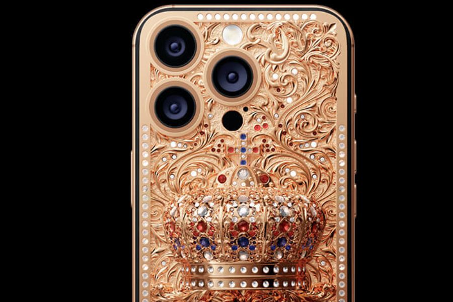 The centerpiece of Caviar's new collection: iPhone 16 Pro Max is titled "The Great, The Terrible, The Magnificent." This luxurious phone has a crown with solid 18-karat gold and precious gemstones.