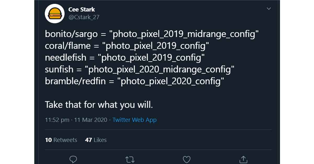 Guys from 9To5Google dived deep into the Google Camera app's source code from a prototype of the upcoming Pixel 4a. Inside the source code, they found out different code names referencing to Pixel device of both past and future. From the snippet of the code shared by @Cstark_27, one can easily figure out that the "sunfish" is the only midrange (or the 'a' edition device) that Google will launch this year. We assume sunfish refers to Pixel 4a which is making headlines these days. This would mean that we won't be seeing the Pixel 4a XL.