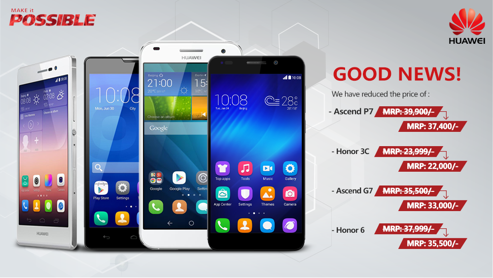 Recently, Huawei device Nepal has also slashed the prices of Ascend G7, Ascend P7 and Honor 6. Ascend G7 is priced at Rs. 33,000, Ascend P7 at Rs.37,400 and Honor 6 at Rs.35,500.