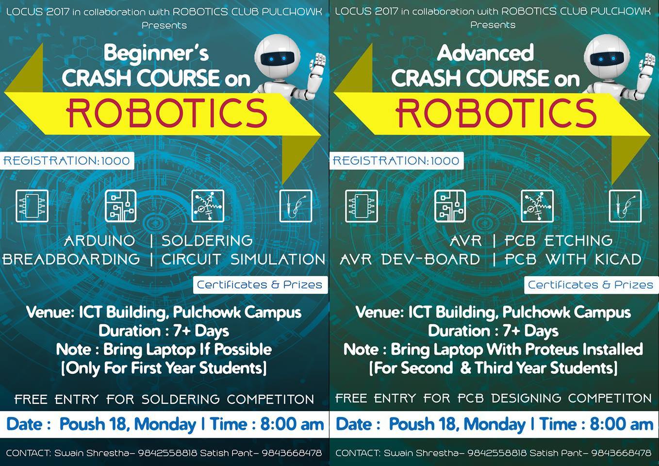 This course has been introduced to enlighten the basic ideas and principles regarding the field of electronics and making them capable of building hardware projects. This course is categorized into two levels. One is beginners’ Robotics Crash Course designed for the rookies and another is an advanced Robotics Crash Course, which is designed for the ones having a sound knowledge of basic theory and principles of electronics. Students from any engineering colleges can book a seat for themselves. The registration fee is Rs. 1000 and the course will last for more than 7 days. Every detail of this pre-event is mentioned on the photo, which is attached herewith.