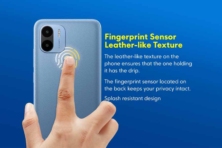 The Poco C51 has a design that is very identical to the Redmi A2+. Here as well, you get a leather-like texture on the back as well as a fingerprint sensor. With a thickness of 9.1mm and a weight of 191g, the phone is quite big and hefty. It is available in two colors: Power Black and Royal Blue.