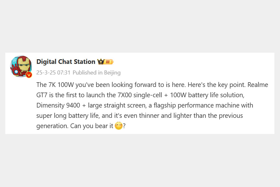 Realme GT 7 will feature the Dimensity 9400 Plus chipset. There is no information regarding the 9400 Plus, but it is expected to be slightly overclocked version of the regular 9400. Realme aims to be the first to launch a smartphone with the Dimensity 9400 Plus chipset. Competing models include devices from Oppo, Vivo, iQOO, Redmi, and OnePlus.