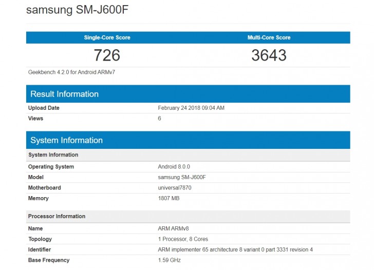 According to Geekbench, the Galaxy J6 will feature 2 GB of RAM to help with performance and multi-tasking. And as for the software purpose, the device that ran the Geekbench tests ran on Android v8.0 Oreo, so we can expect the J6 to feature the latest and greatest from Google. It has scored 726 (single-core) and 3643 (multi-core) on Geekbench. We are yet to receive any news on the pricing and availability of this device.