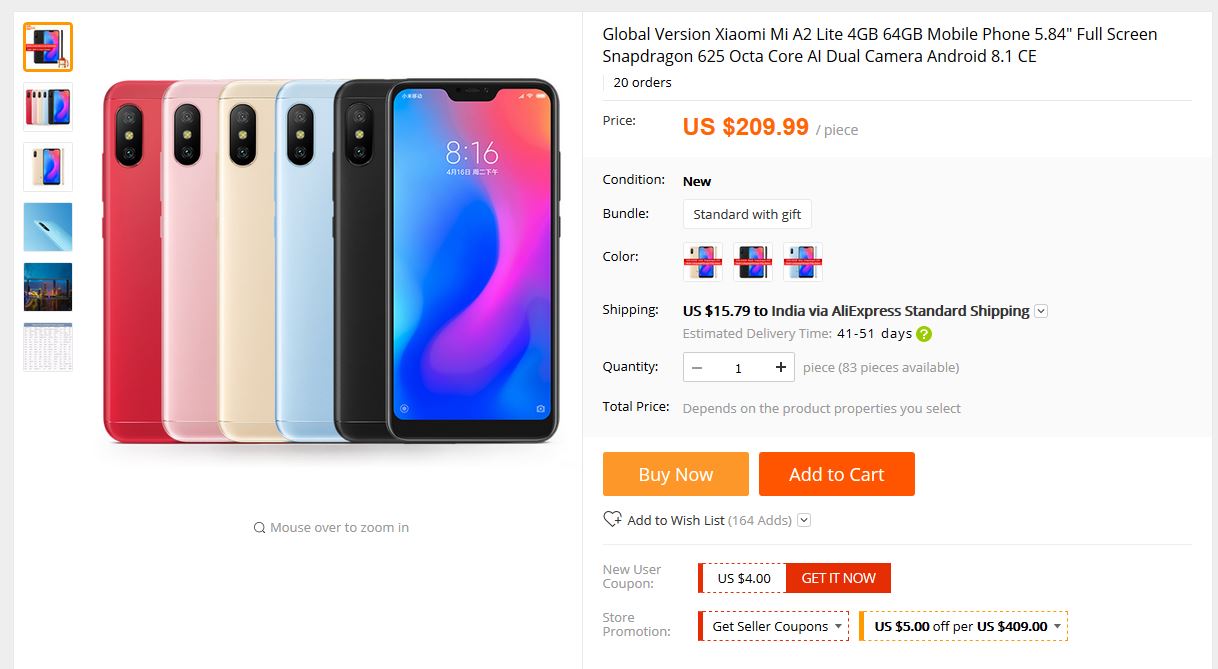 Xiaomi’s Android One smartphone- The Xiaomi MI A2 was expected to unveil on 24th July in Spain along with its lighter version. However, the Xiaomi Mi A2 Lite has been spotted on sale on popular Chinese e-commerce AliExpress in 2 variant. Although it isn’t the official launch the Ali Express is providing shipping globally. Hence leaking its specifications, designs, and price.